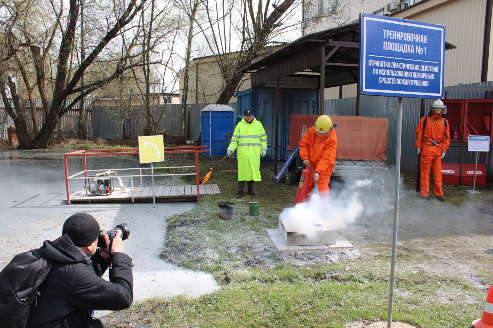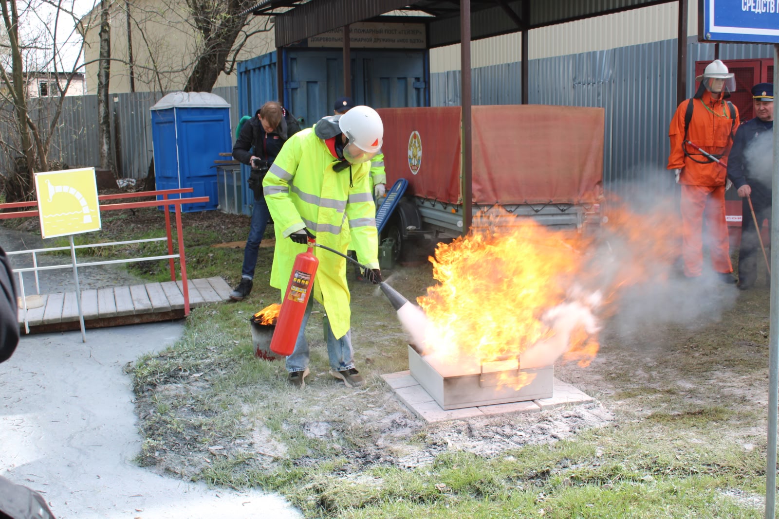 Представители СМИ стали свидетелями того, как добровольцы работали первичными средствами пожаротушения по тушению модельного очага пожара и условного возгорания автомобиля.